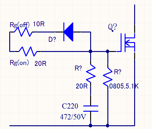3、對于中等功率的電源(300W到1500K)對于MOS管的驅(qū)動設(shè)計不僅需要開通電阻和關(guān)斷電阻分開,還需要對驅(qū)動米勒平臺進(jìn)行處理。一般簡單的處理方式會在MOS管的GS之間增加一組RC電路,通過調(diào)整RC參數(shù)來調(diào)整MOS管米勒平臺內(nèi)振蕩的問題。設(shè)計方式如下。