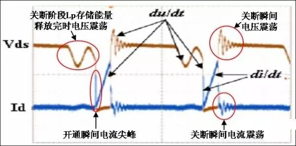 反激式轉(zhuǎn)換器在正常工作情況下,當MOSFET關(guān)斷時,初級電流(id)在短時間內(nèi)為 MOSFET的Coss(即Cgd+Cds)充電,當Coss兩端的電壓Vds超過輸入電壓及反射的輸出電壓之和(Vin+nVo)時,次級二極管導(dǎo)通,初級電感Lp兩端的電壓被箝位至nVo。因此初級總漏感Lk(即Lkp+n2×Lks)和Coss之間發(fā)生諧振,產(chǎn)生高頻和高壓浪涌,MOSFET上過高的電壓可能導(dǎo)致故障。