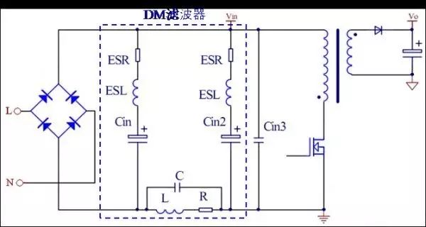 (1)差模濾波器可以濾除差模電流,如圖21所示,差模濾波器是由電感和電容組成的二階低通濾波器,由于其電感有雜散電容,對高頻干擾噪聲可以由雜散電容旁路,使濾波器不能起到有效的作用,采用幾個電解電容并聯(lián)可以減小ESL和 ESR,降低開關(guān)電流的高次諧波因為輸入電解電容的ESL和ESR形成的差模電流。