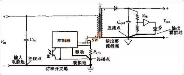 (6)開關(guān)電源內(nèi)部接地的合理性直接影響到電源的電磁干擾甚至影響其穩(wěn)定工作,圖26給出了反激轉(zhuǎn)換器的地線安排情況,其中電源地是電流環(huán)路底下的支路;控制地是連接控制集成電路和與之相關(guān)的無源器件的地。控制地非常敏感,因而要在其他的交流電流環(huán)路都布置好后再放置,必須通過一些特定的點與其他地連接,這個連接點是產(chǎn)生控制IC所要檢測的小電壓的所有器件的公共連接點,包括電流型變換器電流檢測電阻的公共接點和輸出端電阻分壓器的下端。除此之外,每條大電流的地線要短而寬,輸入濾波電容的公共端應(yīng)作為其他交流電流地的唯一接點。