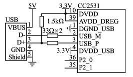 CC2531的USB硬件連接很簡單,如圖3所示。采用USB總線供電方式,通過電壓轉換芯片AM11173.3為硬件電路提供3.3 V電壓(圖中未畫出)。由于該設備為全速設備,因此D+信號線通過電阻上拉。