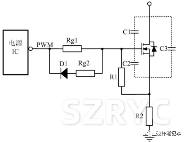 MOS管一般都是慢開快關(guān)。在關(guān)斷瞬間驅(qū)動電路能提供一個盡可能低阻抗的通路供MOSFET柵源極間電容電壓快速泄放,保證開關(guān)管能快速關(guān)斷。 為使柵源極間電容電壓的快速泄放,常在驅(qū)動電阻上并聯(lián)一個電阻和一個二極管,如上圖所示,其中D1常用的是快恢復(fù)二極管。這使關(guān)斷時間減小,同時減小關(guān)斷時的損耗。Rg2是防止關(guān)斷的時電流過大,把電源IC給燒掉。