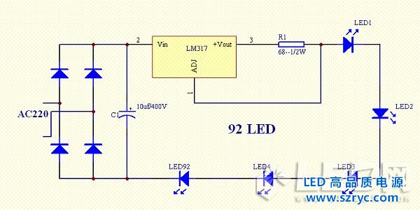 LED要恒流供電,不然容易老化損壞??梢杂肔M317,原理是利用317的啟探控電壓不變,再除電阻,就是恒流值。電路如下圖。燈可以根據(jù)需求接多少個。改變R1可改變電流,電流=1.25/R1。