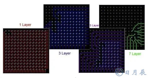 與此同時,當(dāng)采用“從中心到外圍”的布線方法時,退出到外圍所要求的通道數(shù)量不會隨著層的改變而改變。這將極大地減少層的數(shù)量。對于尺寸為28x28mm的元件來說,7層就足夠了。對于尺寸更大的元件,還可以取得雙贏。圖17顯示了BGA的四分之一部分。