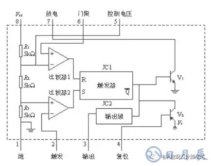 555時基電路由分壓器R1、R2、R3,兩個比較器,R-S觸發(fā)器以及兩個晶體管等組成,電路在5~18V范圍內(nèi)均能工作。分壓器提供偏壓給比較器1 的反相輸入端,電壓為2Vcc/3,提供給比較器2的同相輸入端電壓為Vcc/3,比較器的另兩個輸入端腳2、腳6分別為觸發(fā)和門限,比較器輸出控制R- S觸發(fā)器,觸發(fā)器輸出供給輸出級以及晶體管V1的基極。當觸發(fā)器輸出置高時,V1導通,接通腳7的放電電路;當觸發(fā)器輸出為低時,V1截止,輸出級提供一 個低的輸出阻抗,并且將觸發(fā)器輸出脈沖反相。當觸發(fā)器輸出置高時,腳3輸出的電壓為低電平,觸發(fā)器輸出為低時,腳3輸出的電壓為高電平。輸出級能夠提供的 最大電流為200mA,晶體管V2是PNP管,它的發(fā)射極接內(nèi)部基準電壓Vr,Vr的取值總是小于電源電壓Vcc,因此,若將V2的基極(腳4 復位)接到Vcc上,V2的基—射極為反偏,晶體管V2截止。