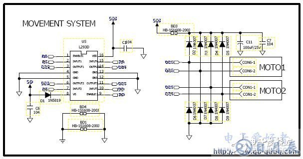 單片機部分不說了,L293部分用的BD1什么的是磁珠,用磁珠來實現(xiàn)單點接地和電源隔離。那幾個IN4007是續(xù)流二極管。那幾個電容式濾波電容就不多少了。