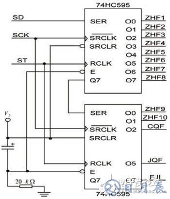 檢測(cè)儀通過(guò)C8051F350單片機(jī)執(zhí)行電磁閥的開閉動(dòng)作、控制鼓風(fēng)機(jī),為了盡量少占用單片機(jī)的I/O口,引入74HC595芯片,如圖4所示,設(shè)計(jì)串行口多路氣閥控制電路。74HC595內(nèi)含8位串入、串/并出移位寄存器和8位三態(tài)輸出鎖存器。將第一個(gè)74HC595的Q7與第二個(gè)的SER相接,單片機(jī)只需控制第一個(gè)74HC595的SER、 SRCLK和RCLK三個(gè)引腳,就可使多路氣閥和風(fēng)機(jī)等的開閉得到控制。