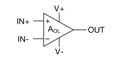 圖1描述了運(yùn)算放大器的標(biāo)準(zhǔn)示意圖符號(hào)。有兩個(gè)輸入端(IN+, IN-)、一個(gè)輸出端(OUT)和兩個(gè)電源端(V+, V-)。這些端的名稱可能因制造商而異,甚至單個(gè)制造商也可能使用不同的名稱,但它們?nèi)匀皇窍嗤奈鍌€(gè)端。