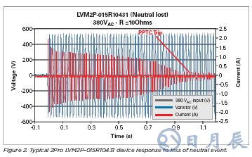 在過(guò)壓瞬變的情況下,如圖2所示的中性損失事件,2Pro器件中的PPTC元件就會(huì)發(fā)熱、跳脫并進(jìn)入一種高阻抗狀態(tài),從而幫助降低MOV器件失效的風(fēng)險(xiǎn)。
