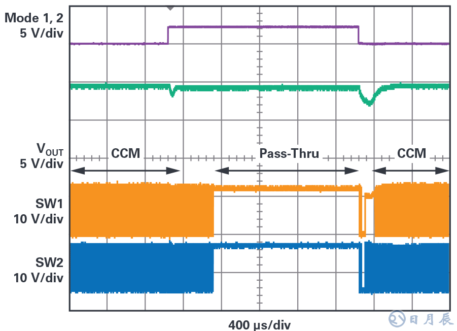 對于兩方面都想實現(xiàn)最佳效果的人來說,可以使用LT8210,它可以通過切換MODE1和MODE2引腳,在不同的工作模式之間切換。換句話說,LT8210在某些情況下可以作為具有固定輸出電壓(CCM、DCM,或Burst Mode™)的傳統(tǒng)的降壓-升壓穩(wěn)壓器運行,然后,在應用條件變化時,轉(zhuǎn)而采用帶通模式。對于常開系統(tǒng)和啟停應用而言,這個特性非常有用。