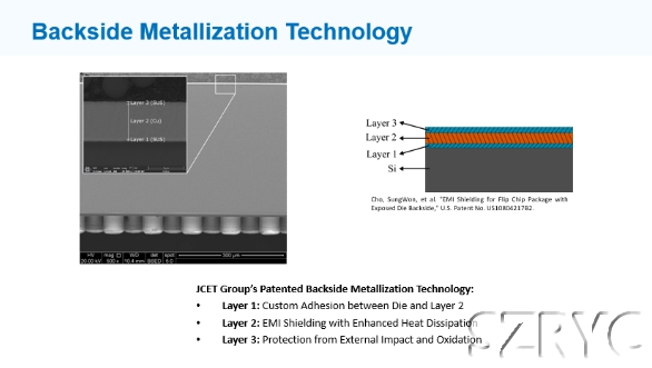 長電科技的工程驗(yàn)證結(jié)果表明,與其他方案相比,芯片背面金屬化技術(shù)更適用于加強(qiáng)低、中功率范圍的倒裝型結(jié)構(gòu)的導(dǎo)熱性,同等成本條件下,散熱效果的裕值可達(dá)到25%,可謂立竿見影。而電磁干擾屏蔽材料的背面金屬化技術(shù)同樣可以用于芯片背面金屬化。
