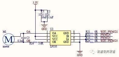 功能板上提供了一個小直流電機,其接口電路如圖2所示。它是通過L9110進行驅(qū)動,當在IA和IB兩端施加相異的電平時,就可控制電機的正反轉(zhuǎn)。