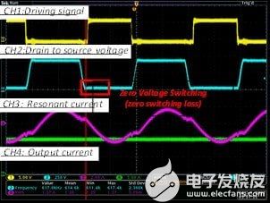 設(shè)計的高頻 LLC 轉(zhuǎn)換器在半載和滿載下工作的關(guān)鍵波形如圖 11 和圖 12 所示。