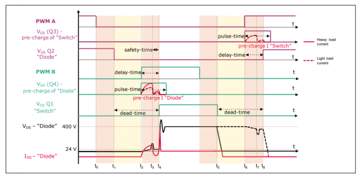 主要波形如圖4所示。在t0之前的狀態(tài)下,電感器通過Q1充電,一旦Q1關(guān)閉,電感電流就會(huì)流過Q2,首先通過其本體二極管,然后在Q2開啟后流過器件通道。 因此,在Totem pole PFC中,Q2開啟時(shí)工作在零電壓(ZVS)開關(guān)。 在t0時(shí),PWM A 信號(hào)置低,經(jīng)過一定的延遲時(shí)間后(Ry與Cy的延遲) ,Q2的柵源極電壓信號(hào)(VGS)也在t1置低。 在半橋的死區(qū)(Dead?TIme)時(shí)間內(nèi)(t1到t2),電感電流通過Q2的體二極管續(xù)流。在t2之前,Q2的VDS被鉗位到地并且所有自舉電容器(CHS_P除外)都被驅(qū)動(dòng)電壓和24V電壓充電(圖五a與b)。 然后在死區(qū)時(shí)間(Dead?TIme)后,PWM B 置高,通過Cx、Rx 產(chǎn)生Q4的短暫柵極電壓。因此,預(yù)充電的Q4會(huì)在t2開啟(圖五c),預(yù)充電電流流經(jīng)Q4到D2到Q2的網(wǎng)絡(luò)中,這種預(yù)充電流的的幅度必須高于流經(jīng)Q2體二極管的續(xù)流電流。 在預(yù)充電流結(jié)束時(shí)(t3),Q2的漏-源極電壓被預(yù)充電至24V。
