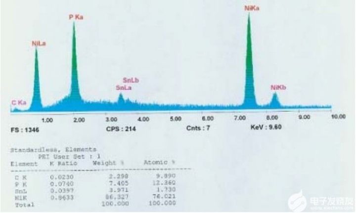 圖31是圖21標識B處焊料的能譜圖,由圖可發(fā)現(xiàn)主要含有錫(Sn),磷(P), 鎳(Ni),碳(C)等元素,由譜圖中檢測到鎳含量較多,這也能進一步說明PCB焊盤上的鎳鍍層與焊料之間未形成良好的金屬間化合物層。