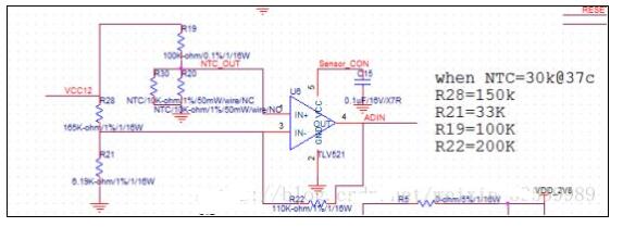 首先對1.0版本溫度貼硬件做一個(gè)簡單描述:該方案的測溫方式是使用熱敏電阻NTC,采集其模擬電壓并轉(zhuǎn)換為相應(yīng)的溫度值,原理圖如圖1所示,使用單運(yùn)放TLV521搭建一個(gè)橋,起初,對多片焊接完整的溫度貼線路板進(jìn)行溫度準(zhǔn)確度測試,發(fā)現(xiàn)測得溫度與實(shí)際水溫偏差較大且不一致,正偏和負(fù)偏均存在,無規(guī)律可尋,由于本產(chǎn)品對測溫精度的要求為-0.1~+0.1°,所以該結(jié)果未能滿足要求,一開始想過對不同偏差的板子通過一條擬合曲線對溫度進(jìn)行校準(zhǔn),但采集了多組數(shù)據(jù)后找到一條擬合曲線加進(jìn)去后仍無法全部滿足要求且耗時(shí)較長,放棄了此方式校準(zhǔn),故進(jìn)行了以下分析測試;