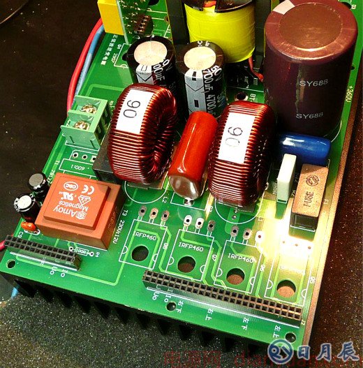 這個機器,BT是12V,也可以是24V,12V時我的目標是800W,力爭1000W,整體結(jié)構(gòu)是學習了鐘工的3000W機器,也是下面一個大散熱板,上面是一塊和散熱板一樣大小的功率主板,長228MM,寬140MM。升壓部分的4個功率管,H橋的4個功率管及4個TO220封裝的快速二極管直接擰在散熱板;DC-DC升壓電路的驅(qū)動板和SPWM的驅(qū)動板直插在功率主板上。