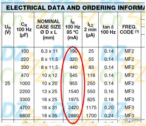 上圖是耐壓值為25V的濾波電容的部分數(shù)據(jù),相同工藝及容量下,耐壓越高則相應(yīng)的紋波允許電流也越高,那濾波電容的容量過大為什么又會產(chǎn)生更大的紋波電流呢?