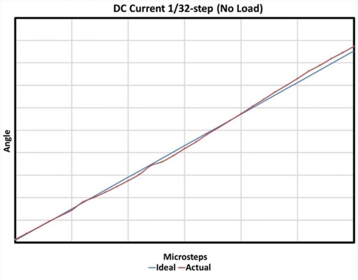 采用這種裝置測量的結(jié)果顯示出了很小的非線性度;但總體而言,角度精度良好,約為 ±0.03°。而且,電機運動具有單調(diào)性(參見圖 3);也就是說,電機永遠(yuǎn)不會朝錯誤的方向移動或無法移動。如果出現(xiàn)這類錯誤,那只能說明電機本身具有固有誤差,或者測量錯誤。在這里,1/32 步對應(yīng)精度為0.056°。