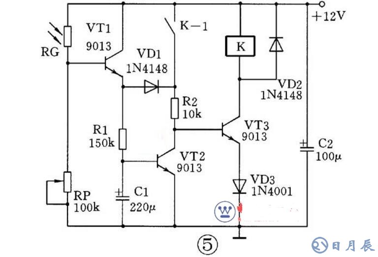 圖3是一個實用的光控延遲開關(guān),工作條件是:需要為RG外面制作一個遮光筒,這樣平時無論外面光線強弱如何,只要無直射光線射入遮光筒,RG均無強光照射而呈高電阻。圖3~圖5電路均有此要求。電路工作過程是:平時RG為高電阻,VT1截止,VT2也同樣截止,K不動作。當(dāng)用手電筒或激光筆對準(zhǔn)遮光筒里的RG照射一下,RG立刻呈低電阻,VT1導(dǎo)通,因VT1導(dǎo)通時其等效電阻很小,C1很快充滿電荷,VT2也導(dǎo)通,K吸合,被控電器工作。停止光照后,VT1雖恢復(fù)截止,但C1所儲存的電荷可通過R向VT2發(fā)射結(jié)放電,仍能維持VT2保持導(dǎo)通態(tài)。C1電荷隨放電逐漸減少,當(dāng)不足以維持VT2導(dǎo)通時,VT2即截止,K釋放,被控電器停止工作。電路延遲時間主要由R與C1放電時間常數(shù)決定,但VT2的β值對延遲時間影響很大,若β值較小,就限制了R的取值,故要求β值在200以上,VT2最好能采用達林頓復(fù)合管。