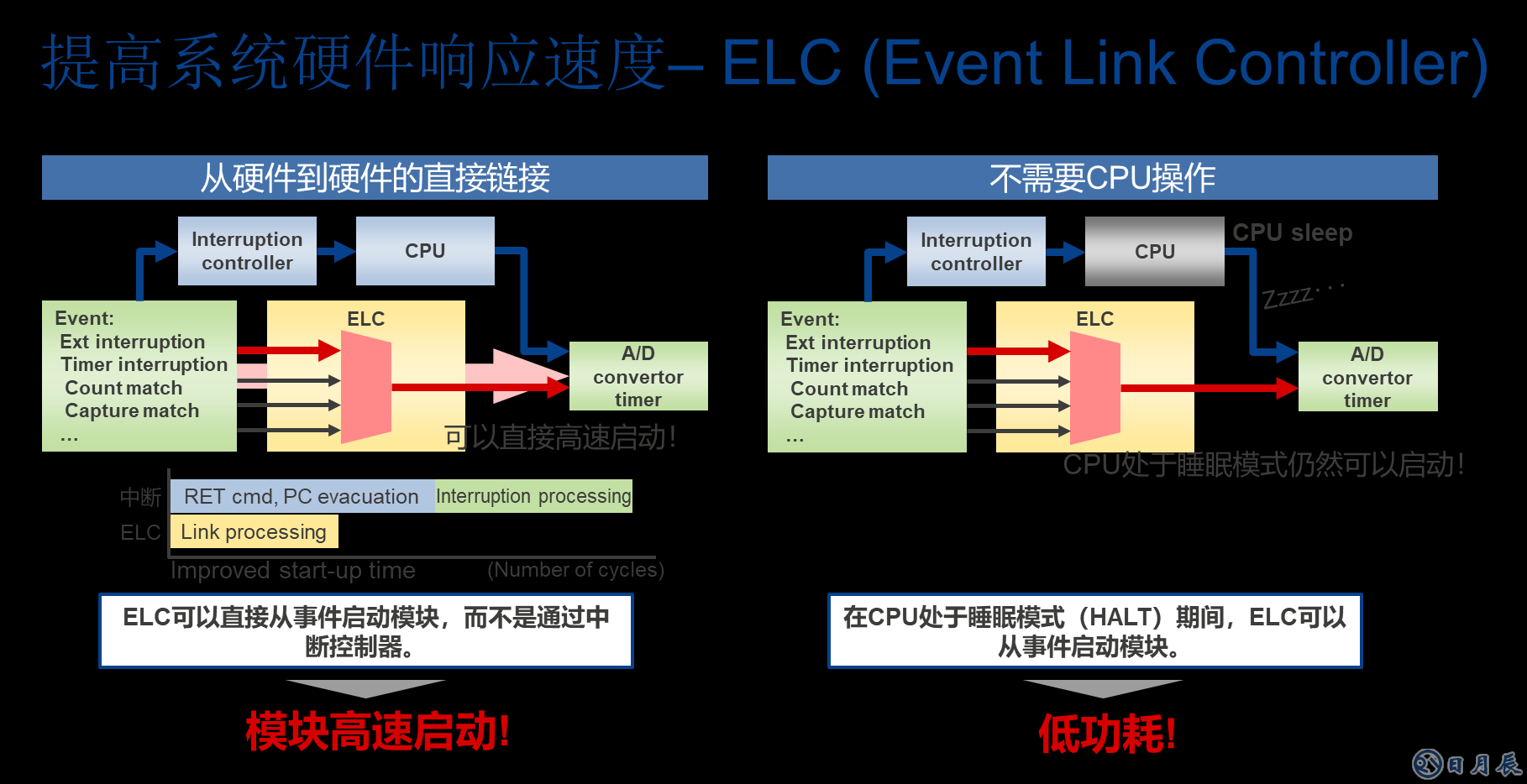 下圖中,ELC可以直接從事件啟動(dòng)模塊,而不是通過(guò)中斷控制器。而在CPU處于睡眠模式(HALT)期間,ELC也可以從事件啟動(dòng)模塊,從而在提高系統(tǒng)硬件響應(yīng)速度的同時(shí)降低了功耗