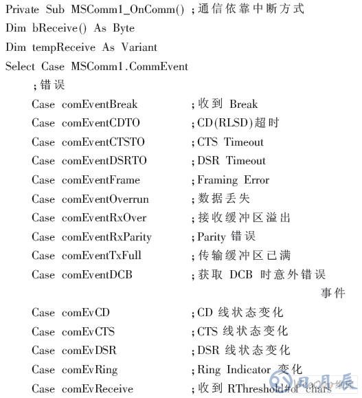 串行口初始化完成后利用MSComm控件可以從串口實(shí)時(shí)的接收數(shù)據(jù)。ONComm是MSComm控件的通信事件處理函數(shù)。其串口通信的程序?yàn)椋?/font>