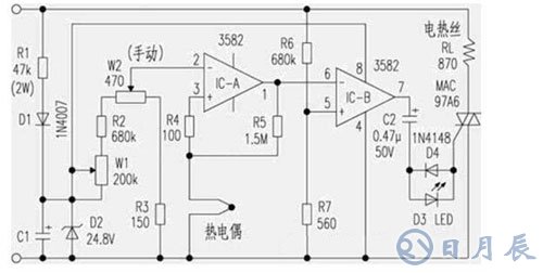 該電烙鐵控溫范圍是100℃~400℃,調(diào)溫標志標明低、中、高位,控溫精度標稱±5%,采用了熱電偶傳感器??刂齐娐凡捎昧私涣魇须娭苯咏祲?、濾波、穩(wěn)壓供電方案。工作原理見下圖。 市電AC220V經(jīng)R1降壓、D1半波整流、D2削波穩(wěn)壓、C1濾波后作為比較器件IC的電源電壓及調(diào)溫設(shè)定電壓源。IC-Q③腳為熱電偶檢測電壓輸入端(與溫度值對應(yīng));②腳為調(diào)溫設(shè)定電壓。在②、③腳兩端電壓比較后,由①腳輸出。其中R5的作用是將輸入的很少一部分反饋至同相輸入端③腳,以使在小信號波動時輸出鎖定不變。當熱電偶檢到溫度偏低時;③腳電平相對②腳低,使輸出①腳也低。進而使IC-B放大器⑥腳相對于固定偏置的⑤腳偏低,使輸出⑦腳為高。由于IC-B⑤腳電壓是由AC220V經(jīng)R6、R7分壓而得,因而,頻率、相位完全與AC220V相同。與⑥腳直流比較后在⑦腳輸出交流電壓。該交流電壓經(jīng)C2、D4、D3和D4反向并聯(lián)(作用同雙向二極管)觸發(fā)雙向可控硅,使相應(yīng)的電壓加到烙鐵電熱絲上,以達到恒溫的目的。