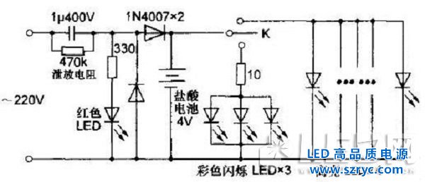 根據(jù)實(shí)物畫出的電路工作原理圖如圖所示,220V交流市電經(jīng)電容降壓、二極管整流后給鉛酸蓄電池充電,紅色LED作充電指示。充好電后使用時(shí)閉合按鈕開關(guān)K,將首先接通3顆彩色閃爍LED,發(fā)出夢幻般變化莫測的七彩光芒,在夜間平添一些生活樂趣,再按一下開關(guān)K則關(guān)閉彩色閃爍LED,接著再按才會接通24顆并聯(lián)的高亮LED,由于數(shù)目較多,照明效果很好。