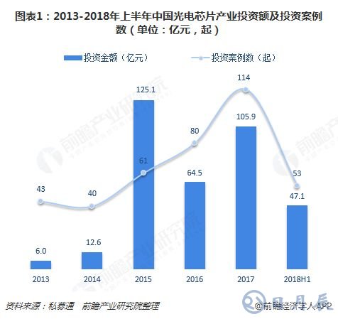 數(shù)據(jù)顯示,2013-2017年,中國光電芯片產(chǎn)業(yè)投資額最高時僅有125.1億元,還是受2015年三安光電、力成科技兩起數(shù)十億級大額事件影響,投資案例數(shù)最高為114起。2018年上半年,投資額再度下滑,不到2017年的一半,投資案例數(shù)53起。