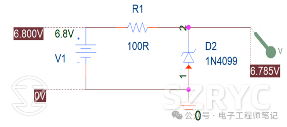 源電壓將是可以施加到電路的最大值。例如,可能發(fā)生或可以作為電源電壓施加的最大過(guò)電壓可以是 13V。 因此,電阻兩端的電壓降將為 = 13V-6.8V = 6.2V 根據(jù)歐姆定律,電阻值將為 = 6.2V / 0.060 A = 103R 可選擇標(biāo)準(zhǔn)值 100R 電阻。