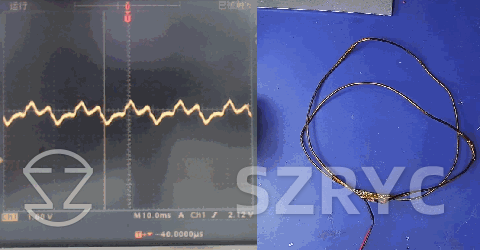 但使用檢測線圈時(shí)勛在一個(gè)最大的問題,就是放大后的信號中存在著較大的工頻干擾信號。這些干擾信號來自于我們房間中存在著市電工頻干擾。下圖現(xiàn)實(shí)了檢測線圈以及在靜止?fàn)顟B(tài)下濾波放大后的信號。