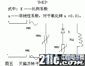 當(dāng)需要滅磁時,指令快速直流開關(guān)FMK分?jǐn)?,它很快切斷轉(zhuǎn)子繞組與勵磁電源的聯(lián)系。轉(zhuǎn)子作為一個大電感,使di/dt上升,即勵磁繞組兩端電壓急劇增加,當(dāng)超過氧化鋅壓敏電阻件的轉(zhuǎn)折電壓時,YMR立即工作在II區(qū)而呈現(xiàn)低阻狀態(tài),轉(zhuǎn)子電流從FMK轉(zhuǎn)移到壓敏電阻上,迅速完成換流過程。轉(zhuǎn)子能量得以通過壓敏電阻釋放,實(shí)現(xiàn)滅磁。在滅磁過程中,YMR兩端亦即轉(zhuǎn)子電壓幾乎為一恒定值。因此,這種滅磁方式接近于理想滅磁狀態(tài)。從FMK開斷到安全建壓僅需要數(shù)毫秒,而整個滅磁過程經(jīng)歷的時間大約為400毫秒??梢姡@種新型的滅磁方式確實(shí)具有操作簡單,滅磁速度快,開關(guān)容量大,過電壓保護(hù)水平可控等獨(dú)特優(yōu)點(diǎn)。