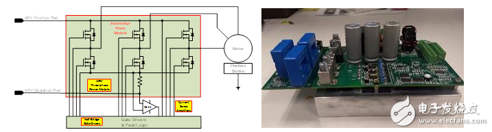 許多48 V子系統(tǒng)由低功耗三相電機驅(qū)動系統(tǒng)組成。這些電機驅(qū)動器最便于通過模塊設(shè)計來實現(xiàn)。安森美半導(dǎo)體的汽車電源模塊(APM)三相模塊系列是理想的選擇。這些模塊為三相輔助電機驅(qū)動系統(tǒng)的構(gòu)建提供了一個緊湊、高效的選擇。該模塊具有功率橋、內(nèi)部分流電阻、緩沖電容器等6個器件,并構(gòu)建在一個隔離的陶瓷基板上。為評估80V APM器件的性能,創(chuàng)建了48 V逆變器參考設(shè)計。系統(tǒng)配置和圖片如圖4所示。