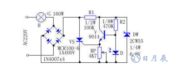 工作原理:電路如上圖所示,220V交流電通過燈泡H及整流全橋后,變成直流脈動電壓,作為正向偏壓,加在可控硅VS及R支路上。白天,亮度大于一定程度時,光敏二極管D呈現(xiàn)底阻狀態(tài)≤1KΩ,使三極管V截止,其發(fā)射極無電流輸出,單向可控硅VS因無觸發(fā)電流而阻斷。此時流過燈泡H的電流≤2.2mA,燈泡H不能發(fā)光。電阻R1和穩(wěn)壓二極管DW使三極管V偏壓不超過6.8V,對三極管起保護作用。夜晚,亮度小于一定程度時,光敏二極管D呈現(xiàn)高阻狀態(tài)≥100KΩ,使三極管V正向?qū)?,發(fā)射極約有0.8V的電壓,使可控硅VS觸發(fā)導通,燈泡H發(fā)光。RP是清晨或傍晚實現(xiàn)開關(guān)轉(zhuǎn)換的亮度選擇元件。