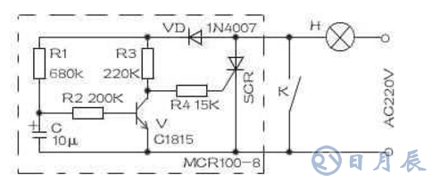 斷開開關(guān)S后,由于電容C1經(jīng)R1、D1和可控硅控制極放電,使可控硅仍有觸發(fā)電流維持導通。放電電流逐漸減小,一段時間后,可控硅截止,燈滅。此電路延時時間約為40~50秒。