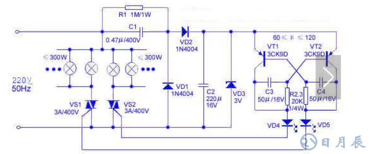 工作原理如下圖所示。交流220V電源經(jīng)C1、VD1、VD2及VD3降壓、整流、濾波后,在VD3兩端得到3V的穩(wěn)定電壓。多諧振蕩器中的VT1、VT2輪流導通,其集電極電流控制雙向晶閘管VS1和VS2工作,彩燈將交替閃爍著光彩。
