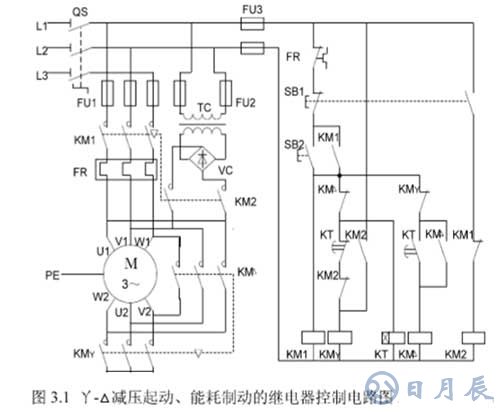 圖3.1中主電路通過三組接觸器主觸點將電動機的定子繞組接成三角形或星形,即KM1、KMY主觸點閉合時,繞組接成星形;KM1、KM△主觸點閉合時,接為三角形;KM2主觸點閉合時定子繞組通過變壓器TC接入一直流電源,轉(zhuǎn)子受到反方向力的作用,產(chǎn)生能耗制動使電機停止。