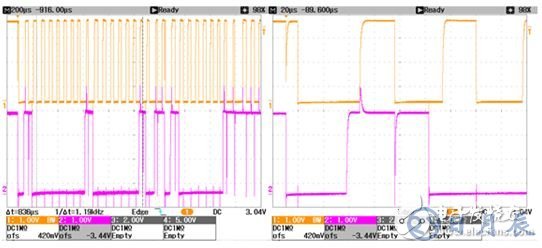 圖4顯示了在我對其進行修改—在信號線之間添加兩個GND信號后的通信信號效果。改動后信號間電容降至約10pF。這樣,瞬態(tài)電壓得到了顯著降低,通信獲得了成功。