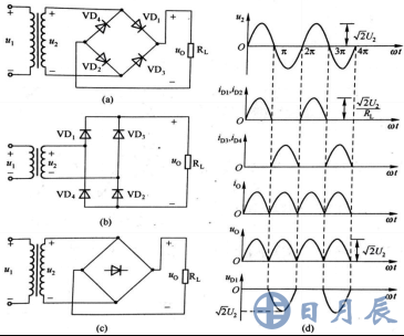 綜上所述,在u2相同的情況下,單相橋式整流電路輸出電壓平均值及其脈動成分和全波整流電路一樣,而二極管承受的最大反向電壓與半波整流電路相同,并節(jié)省電源變壓器一個副邊繞組。