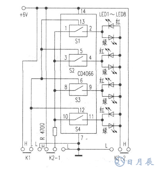 當(dāng)Kl開關(guān)撥向L低電平時(shí),各模擬開關(guān)處于截止?fàn)顟B(tài),無論K2雙向選擇開關(guān)撥向H或L狀態(tài).兩組紅、綠發(fā)光二極管都不會(huì)點(diǎn)亮。