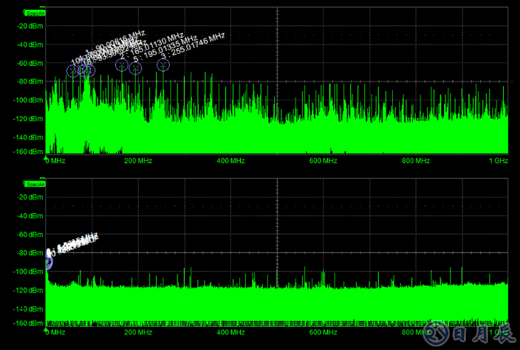 圖2:電池電壓測量的頻譜分析視圖顯示出其真正的寬帶(上部跡線),在下部跡線中顯示的前100 MHz中的特定頻率處達到峰值。
