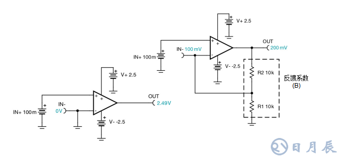圖3比較了開環(huán)運(yùn)算放大器和負(fù)反饋運(yùn)算放大器。這些TINA-TI™軟件仿真電路采用的運(yùn)放是近乎理想的運(yùn)放,加了電源來限制輸出電壓。注意,對(duì)于左側(cè)的開環(huán)配置,輸出幾乎等于正電源(V+)。這是因?yàn)檩斎胍_之間有一個(gè)很小的差異(100mV)。這種小電壓被開環(huán)增益放大,開環(huán)增益會(huì)強(qiáng)制輸出到其中一個(gè)電源電壓。在圖3右側(cè)的負(fù)反饋或閉環(huán)電路中,運(yùn)算放大器輸出上的分壓器需要200 mV的輸出電壓,以便使反相和同相輸入相等。