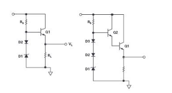 增加二極管D2與齊納二極管串聯(lián),用以部分抵消射極跟隨器Q1引起的額外VBE壓降。類似地,在達林頓配置中添加兩個二極管(D2、D3),同樣用來部分抵消達林頓跟隨器的兩個VBE壓降。