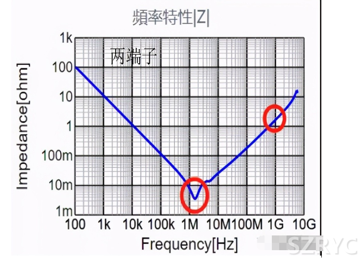 理想的電容,隨著頻率的增加,阻抗越來越低。見下圖的阻抗頻率曲線。