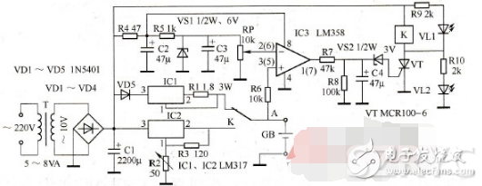 電源輸入變換電路由電源變壓器T、整流二極管VD1~VD4和濾波電容C1組成;恒流充電電路由二極管VD5、三端穩(wěn)壓集成電路IC1和電阻R1組成;恒壓充電電路由三端穩(wěn)壓集成電路IC2和電阻R2、R3組成;電池電壓檢測控制電路由電阻R4~R8、電容C2~C4、電位器RP、穩(wěn)壓二極管VS1、VS2、運算放大器IC3、晶閘管VT和繼電器K組成;工作狀態(tài)指示電路由電阻R9、R10和發(fā)光二極管VL1、VL2組成。