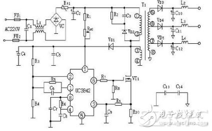 圖2是由UC3842構(gòu)成的開關電源電路,220V市電由C1、L1濾除電磁干擾,負溫度系數(shù)的熱敏電阻Rt1限流,再經(jīng)VC整流、C2濾波,電阻R1、電位器RP1降壓后加到UC3842的供電端(⑦腳),為UC3842提供啟動電壓,電路啟動后變壓器的付繞組③④的整流濾波電壓一方面為UC3842提供正常工作電壓,另一方面經(jīng)R3、R4分壓加到誤差放大器的反相輸入端②腳,為UC3842提供負反饋電壓,其規(guī)律是此腳電壓越高驅(qū)動脈沖的占空比越小,以此穩(wěn)定輸出電壓。④腳和⑧腳外接的R6、C8決定了振蕩頻率,其振蕩頻率的最大值可達500KHz。R5、C6用于改善增益和頻率特性。⑥腳輸出的方波信號經(jīng)R7、R8分壓后驅(qū)動MOSFEF功率管,變壓器原邊繞組①②的能量傳遞到付邊各繞組,經(jīng)整流濾波后輸出各數(shù)值不同的直流電壓供負載使用。電阻R10用于電流檢測,經(jīng)R9、C9濾濾后送入UC3842的③腳形成電流反饋環(huán)。所以由UC3842構(gòu)成的電源是雙閉環(huán)控制系統(tǒng),電壓穩(wěn)定度非常高,當UC3842的③腳電壓高于1V時振蕩器停振,保護功率管不至于過流而損壞。
