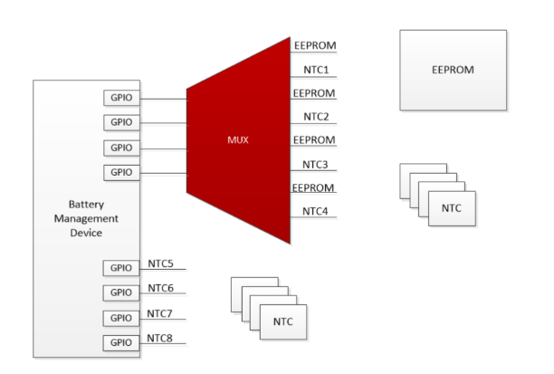 當(dāng)您需要在設(shè)計(jì)過(guò)程后期添加新的系統(tǒng)功能時(shí),SOT-23多路復(fù)用器還可以幫助您處理最后一刻的需求更改。圖3的示例表明,電池監(jiān)測(cè)電路的選擇被鎖定,且所有的GPIO都被用來(lái)測(cè)量系統(tǒng)周?chē)亩鄠€(gè)負(fù)溫度系數(shù)熱敏電阻(NTC)。在設(shè)計(jì)的后期,設(shè)計(jì)人員想增加一個(gè)功能,將電池監(jiān)測(cè)器中的電池壽命信息存儲(chǔ)在電可擦可編程只讀存儲(chǔ)器(EEPROM)中。