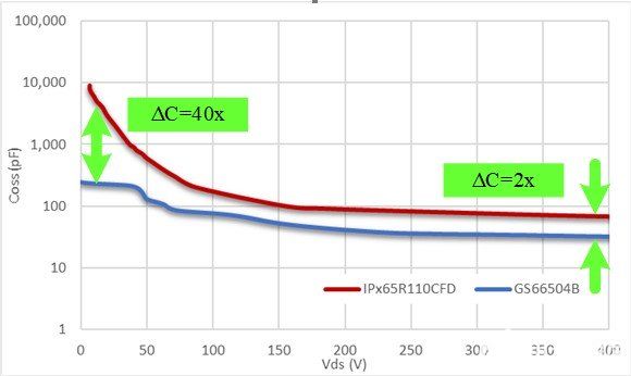 Si MOSFET 的 Coss 在低電壓下是高度非線性的。GaN HEMT 的 Coss 值具有顯著降低的輸出電容 (Coss) 和 Coss 能量,從而導(dǎo)致更短的導(dǎo)通/關(guān)斷周期,如圖 5 所示。該特性允許實現(xiàn)更短的死區(qū)時間和更高的開關(guān)頻率操作。