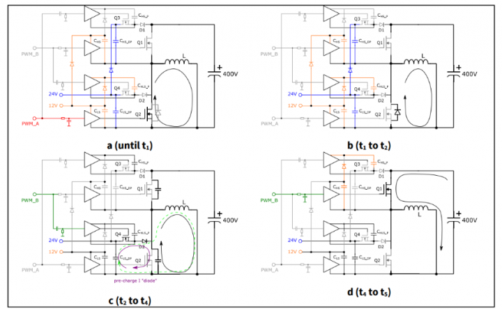 主要波形如圖4所示。在t0之前的狀態(tài)下,電感器通過Q1充電,一旦Q1關(guān)閉,電感電流就會(huì)流過Q2,首先通過其本體二極管,然后在Q2開啟后流過器件通道。 因此,在Totem pole PFC中,Q2開啟時(shí)工作在零電壓(ZVS)開關(guān)。 在t0時(shí),PWM A 信號(hào)置低,經(jīng)過一定的延遲時(shí)間后(Ry與Cy的延遲) ,Q2的柵源極電壓信號(hào)(VGS)也在t1置低。 在半橋的死區(qū)(Dead?TIme)時(shí)間內(nèi)(t1到t2),電感電流通過Q2的體二極管續(xù)流。在t2之前,Q2的VDS被鉗位到地并且所有自舉電容器(CHS_P除外)都被驅(qū)動(dòng)電壓和24V電壓充電(圖五a與b)。 然后在死區(qū)時(shí)間(Dead?TIme)后,PWM B 置高,通過Cx、Rx 產(chǎn)生Q4的短暫柵極電壓。因此,預(yù)充電的Q4會(huì)在t2開啟(圖五c),預(yù)充電電流流經(jīng)Q4到D2到Q2的網(wǎng)絡(luò)中,這種預(yù)充電流的的幅度必須高于流經(jīng)Q2體二極管的續(xù)流電流。 在預(yù)充電流結(jié)束時(shí)(t3),Q2的漏-源極電壓被預(yù)充電至24V。