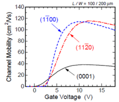 這兩種不同形式的結(jié)構(gòu)差異不僅僅在于是否以內(nèi)嵌的形式制造而成,更主要的差異在于功率晶體的通道是由不同的碳化硅晶體平面制成。硅材料是由純硅所組成,但是碳化硅材料會依照不同的原子排列而有著不同的晶體平面。傳統(tǒng)上平面式結(jié)構(gòu)會采用《0001》的硅平面(Si-face)制作通道,而溝槽式結(jié)構(gòu)功率晶體采用《1120》的晶體平面做為功率晶體的通道,根據(jù)實測結(jié)果,采用《1120》晶體平面時能夠有效利用其較高的電子遷移率,達到低的通態(tài)電阻。